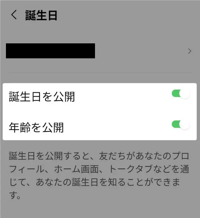 → 「誕生日を公開」スイッチをOFFにすると、リストに表示されなくなります。必要に応じて、限定的に公開も可能です。 - 年齢(生まれ年)だけ非公開にする