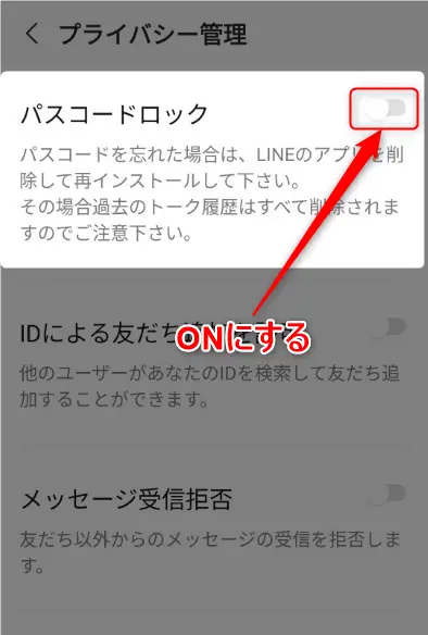 これでLINEを起動する際にパスコード入力が必要となり、万が一他人が操作しようとしてもそれを防ぐことができます。